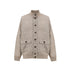 In beige linen, brown button closure, two front pockets with buttons, knitted turtleneck collar and elasticated waistband.