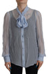Erleben Sie zeitlose Eleganz mit dieser luxuriösen Bluse mit Ascot-Kragen von Dolce & Gabbana . Das mit viel Liebe zum Detail entworfene Oberteil mit raffinierter Knopfleiste und langen Ärmeln verleiht Ihrer Garderobe einen Hauch italienischer Finesse. Der weiche, hellblaue Seidenstoff sorgt für Komfort und Klasse und macht es zu einem Must-have für jeden Modekenner.