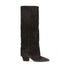 The Jane high Boots by Paris Texas are made of ebony-colored calfskin suede with a square toe and distinctive turn-up. The Texas heel slims the figure and completes a sophisticated design with a contemporary Western style.