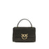 The Calfskin Love Lady Handbag by Pinko, front magnetic button closure, iconic gold-plated and embossed Love Birds logo on front, quilted and padded design, double interior compartment, sliding chain shoulder strap, flat rigid handle at top, interior flat pocket with zipper, iconic tone-on-tone embroidered brand monogram on back.