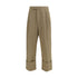 The cotton gabardine Pants with double pleats by Thom Browne embody refined tailoring with a contemporary edge. The high-rise waist and front pleats create a structured yet effortless silhouette, while the smooth gabardine fabric ensures a clean, sharp drape. Wide cuffs stand out as a signature detail, finished inside with the iconic RWB grosgrain trim. Featuring a button-tab closure, slip side pockets and buttoned back welt pockets, they offer a polished and versatile option for elevated daytime dressing.