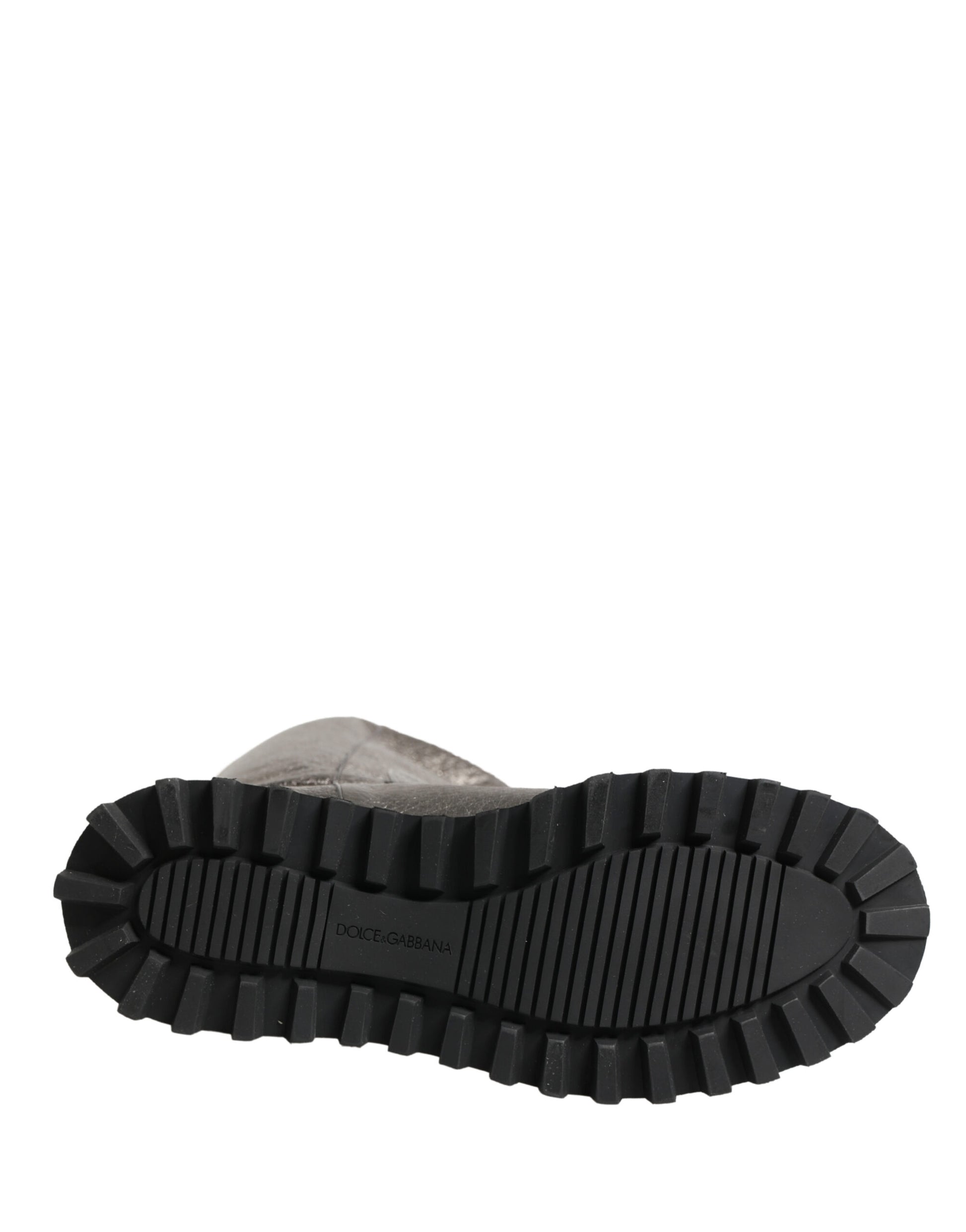 Absolutely stunning, 100% Authentic, brand new with tags Dolce & Gabbana mid-calf boots. Crafted from premium cervo laminato leather, these boots feature a refined metallic silver finish with a structured silhouette. Designed with a bold lug sole for durability and comfort, they are accented by a signature Dolce & Gabbana Milano Italia metal plaque at the ankle, adding an unmistakable luxury touch. A striking blend of elegance and modern edge.