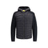 The Nolan hybrid Down Jacket by Parajumpers features an adjustable drawstring hood and front closure with a double-slider zipper. It has three front pockets, a back zipper pocket and two inside pockets with Velcro closure. Equipped with underarm ventilation, it features Lycra trim on the hood, pockets, hem and cuffs. The Parajumpers patch on the sleeve and the iconic yellow tape at the neck closure complete the design.