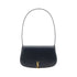 Calfskin Mini Voltaire Shoulder Bag by Saint Laurent, rigid moon design, front flap closure with magnetic button, three-dimensional plaque with iconic YSL brand logo applique on front, single interior compartment.