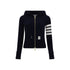 Cotton Hoodie by Thom Browne, zip closure, adjustable drawstring hoodie, front kangaroo pocket, ribbed cuffs and bottom hem, logo patch on front, striped print on left sleeve.