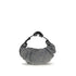 The Grab-D Shoulder Bag by Diesel features a ruched silhouette made of black-wash denim embellished with reflective crystals that add a luminous touch. The belt handle with a hair clip is the distinctive detail that adds personality to the design. The drawstring end is decorated with the resin Oval D logo, while the adjustable belt-style shoulder strap ensures comfort and versatility. The zipper closure completes a practical and characterful bag.