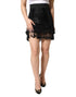 mini skirt features intricate lace detailing with subtle embellishments on sleek black nylon. Designed with a flattering silhouette, it combines feminine sophistication with modern statement style.