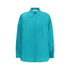 The silk taffeta Shirt by Fendi features an oversized volume that elevates the classic silhouette with modern elegance. The long sleeves with dropped shoulders and shirt cuffs enhance its relaxed line, while the asymmetrical rounded hem adds fluidity to the design. The hidden button closure keeps the look clean and refined. Crafted from light blue silk taffeta, it is a delicate, luxurious piece with a distinctive character.