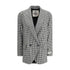 The Gingham Blazer by Fiorucci, crafted from a virgin wool blend in black and white tones. The piece features a Fiorucci logo label at the bottom of the left sleeve, front button closure, peak lapels, removable shoulder pads, long sleeves, and front pockets. Designed with an oversized fit and fully lined. Made in Italy.