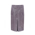 Tom Ford Purple Eco-Leather Lurex Skirt. Side opening with hidden zip, ‘Country’ applique details, belt loops, medium length pencil line, wide front slit, internal lining.