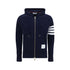 Thom Browne’s Cotton Hoodie features a front zipper closure and an adjustable drawstring hood for a customizable fit. Featuring two welt pockets on the front, it is enhanced by the iconic white bands on the left sleeve and the brand’s logo patch on the front. The ribbed hem and cuffs complete the design, making this sweatshirt a versatile and distinctive garment, perfect for a casual and refined look.