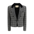 The wool check Jacket by Valentino showcases a sartorial elegance with a strong editorial character. The design is defined by mouliné wool lapels and a refined velvet collar detail, adding a sophisticated textural contrast to the structure. Soutache button fastening completes the piece, emphasizing its craftsmanship and refined appeal.